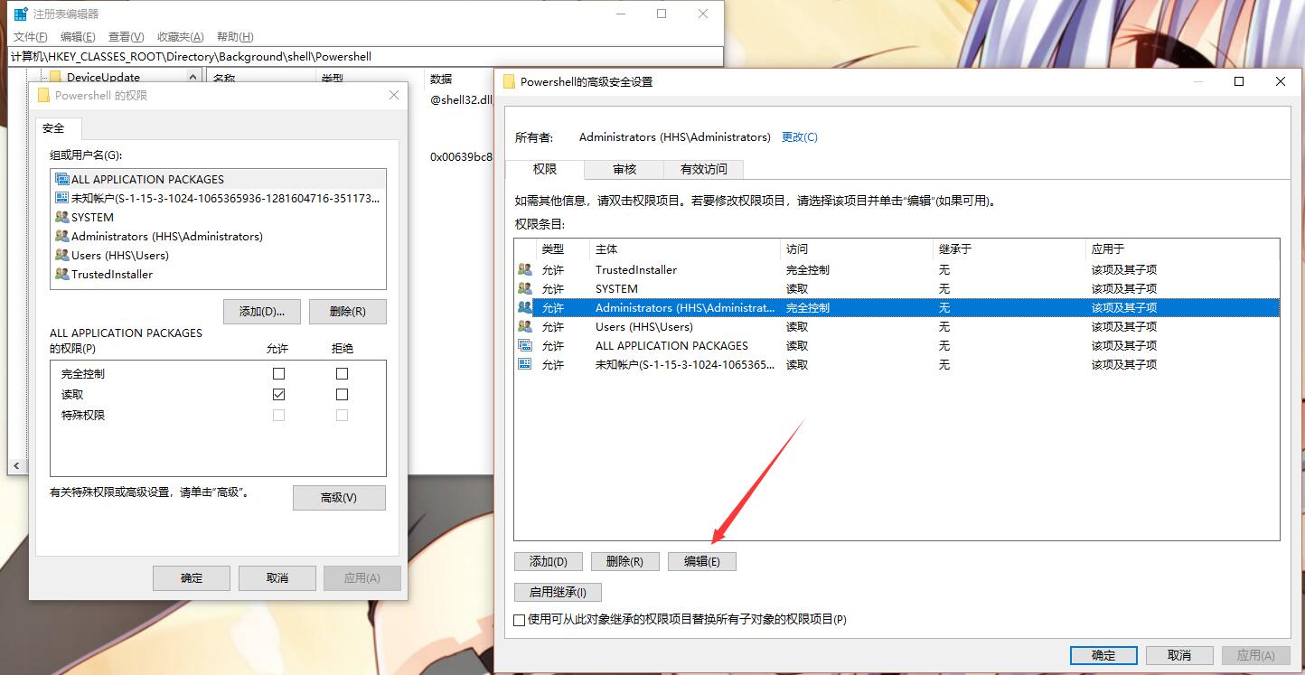 然后在权限条目中选择刚刚新增的用户组,点击编辑按钮,把完全控制勾上。