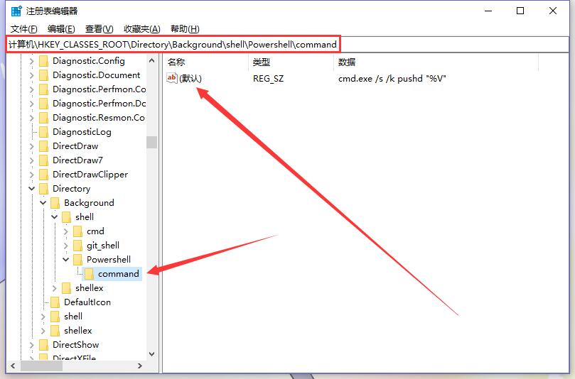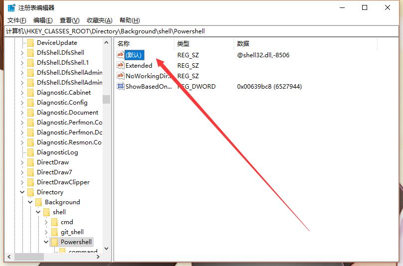 打开 Powershell 的子项目 command ,双击“默认”选项,把值修改为: