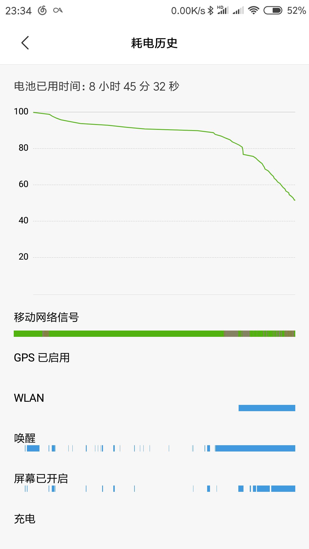 现在感觉很省电,亮屏1小时50分,黑屏外放也有半个小时。