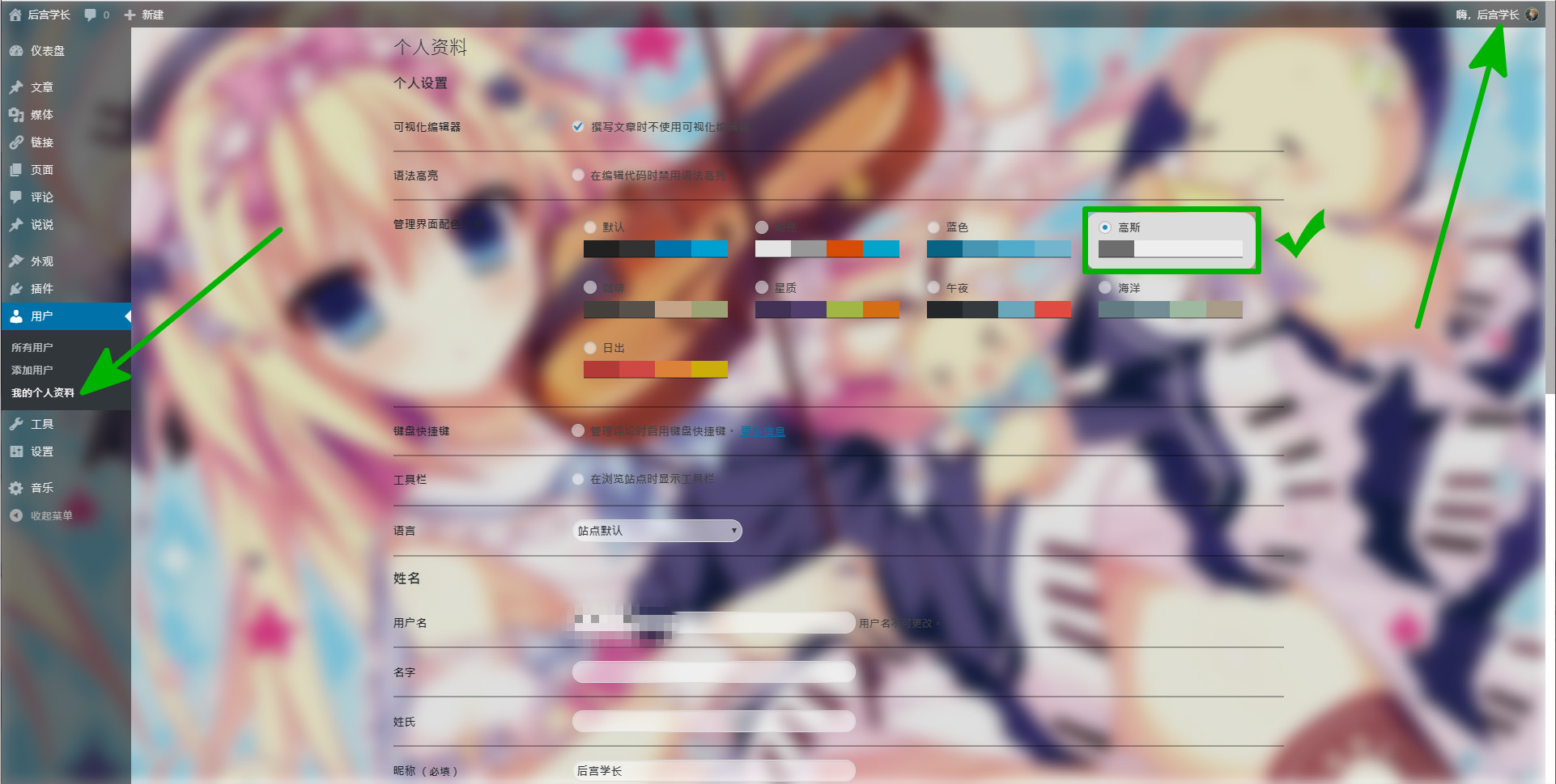 • 在 WordPress 菜单“用户”“我的个人资料”中,管理界面配色方案选择“高斯”,后台就变成“高斯模糊” + “随机背景”啦;