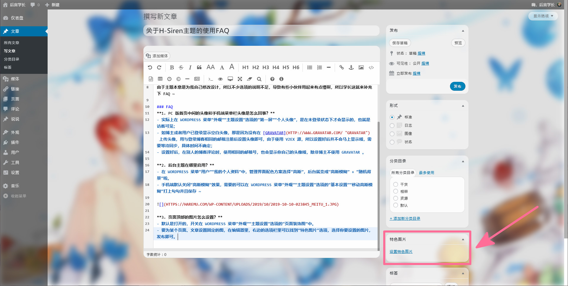 • 要为某个页面、文章设置固定的图,在编辑器里,右边的选项栏里可以找到“特色图片”选项,选择你要设置的图片,发布即可;