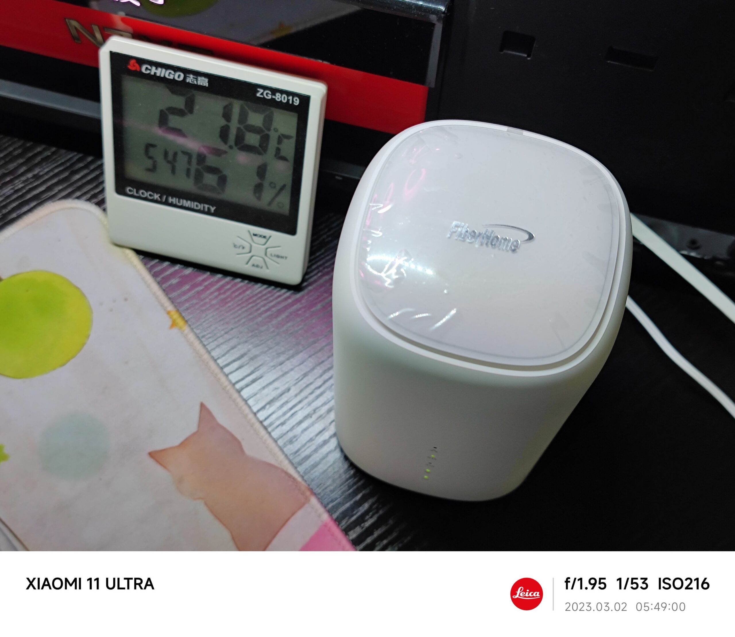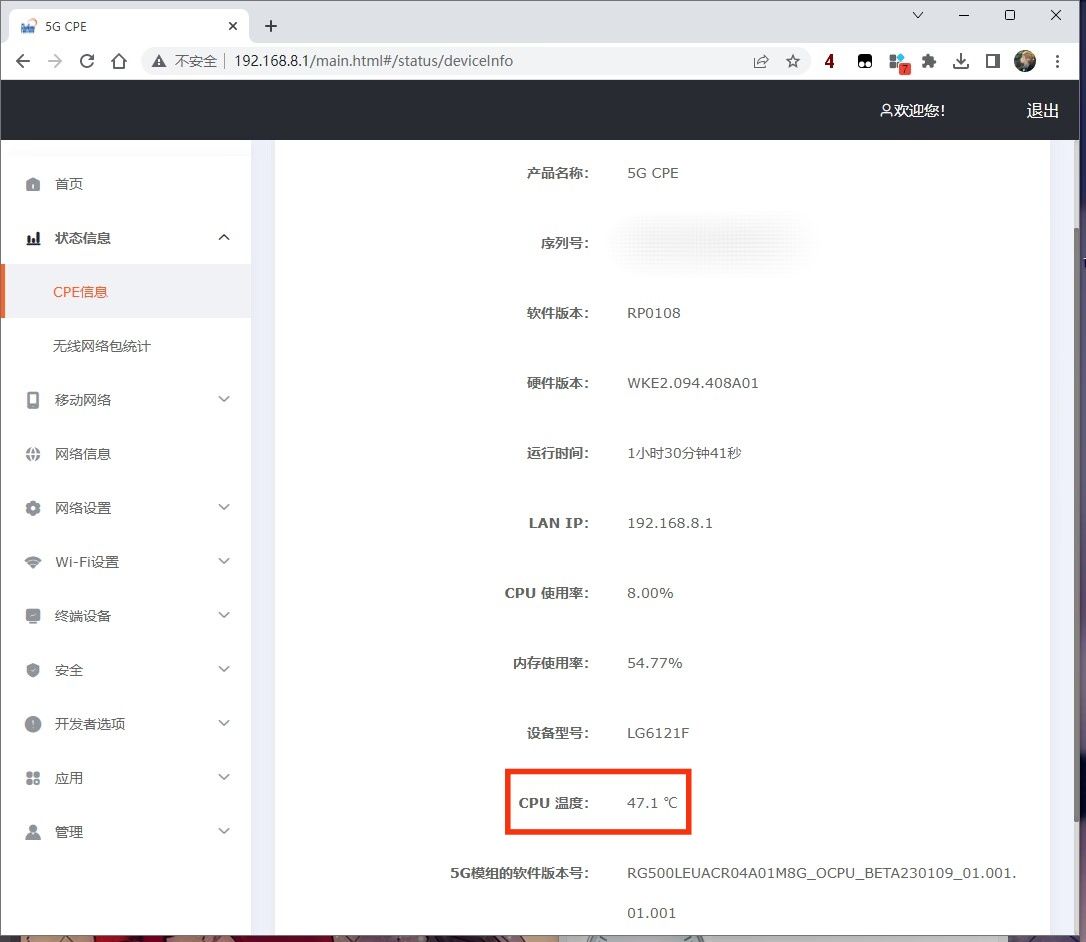 烽火5G CPE在长时间使用下温度表现也非常好,在室温21℃的情况下,CPU温度在40~47℃,未发现有断网卡顿的现象,得益于内置超大散热片,外壳摸着也没啥热量,不同于某些便宜CPE要在底部加装风扇才行
