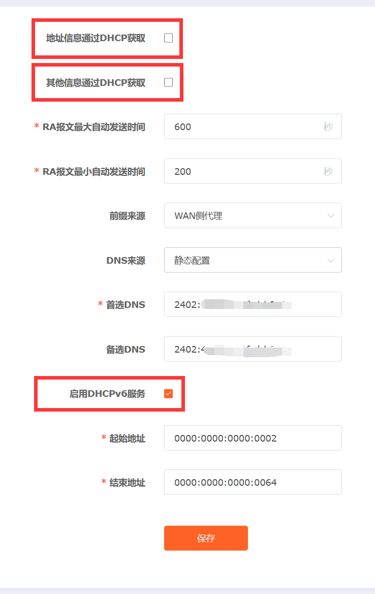 IPv6 DHCP应该是有BUG,两台安卓手机连WiFi都没有获得IPv6,电脑连WiFi可以获得,但有时候也会丢失参数(包括有线),比如网关参数缺失导致IPv6不可用,重新连接又可以